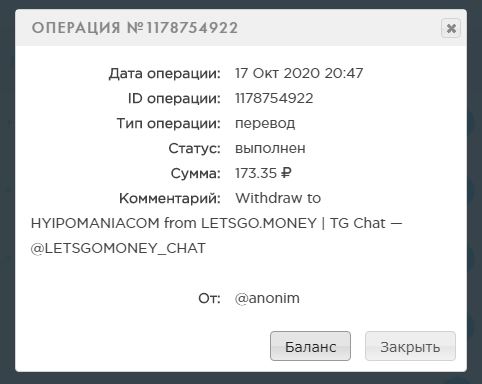 Комментарий: Withdraw to ANNAFED from LETSGO.MONEY | TG Chat — @LETSGOMONEY_CHAT
