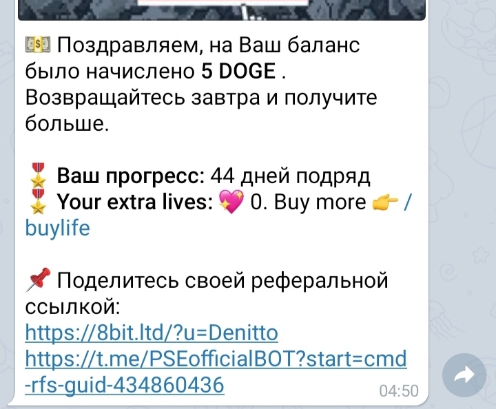 💵 Поздравляем, на Ваш баланс было начислено 1 DOGE . Возвращайтесь завтра и получите больше.