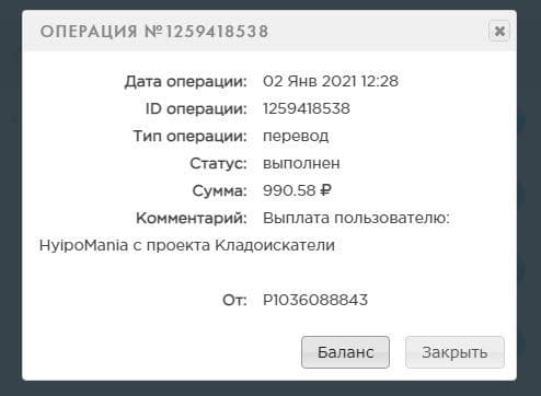 Выплата_пользователю:_raakot_с_проекта_Кладоискатели.