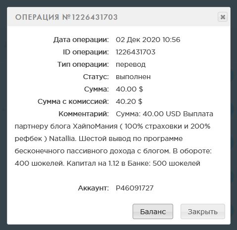 Сумма: 40.00 USD Выплата партнеру блога ХайпоМания ( 100% страховки и 200% рефбек ) Natallia. Шестой вывод по программе бесконечного пассивного дохода с блогом. В обороте: 400 шокелей. Капитал на 1.12 в Банке: 500 шокелейanastasia6 писал(а): ↑Вс ноя 01, 2020 4:36 pmСумма: 35.00 USD Выплата партнеру блога ХайпоМания ( 100% страховки и 200% рефбек ) Natallia. Пятый вывод по программе бесконечного пассивного дохода с блогом. В обороте: 350 шокелей. Капитал на 1.11 в Банке: 500 шокелей