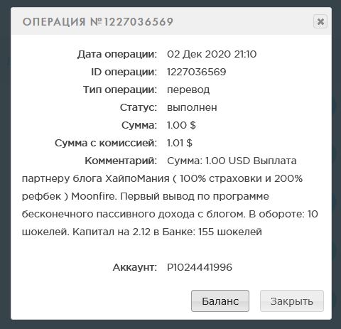 Сумма: 1.00 USD Выплата партнеру блога ХайпоМания ( 100% страховки и 200% рефбек ) Moonfire. Первый вывод по программе бесконечного пассивного дохода с блогом. В обороте: 10 шокелей. Капитал на 2.12 в Банке: 155 шокелей