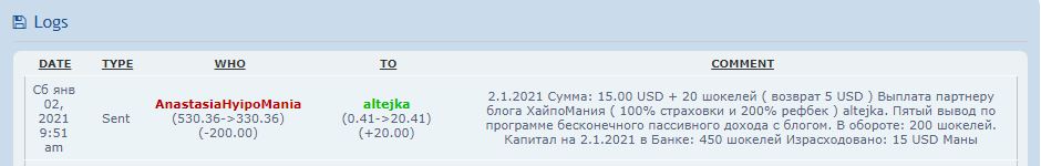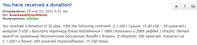 2.1.2021 Сумма: 15.00 USD + 20 шокелей ( возврат 5 USD ) Выплата партнеру блога ХайпоМания ( 100% страховки и 200% рефбек ) altejka. Пятый вывод по программе бесконечного пассивного дохода с блогом. В обороте: 200 шокелей. Капитал на 2.1.2021 в Банке: 450 шокелей Израсходовано: 15 USD Маны