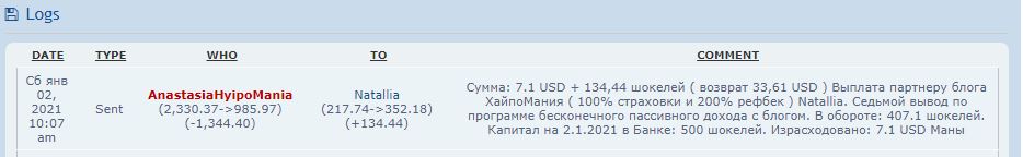02.01.2021 20.73 USD + 117 шокелей ( возврат 29,27 USD ) Выплата партнеру блога ХайпоМания Vitaly2020. Пятый вывод по программе бесконечного пассивного дохода с блогом. В обороте: 500 шокелей. Капитал на 02.01.2021 в Банке: 500 шокелей. Израсходовано: 20.73 USD Маны