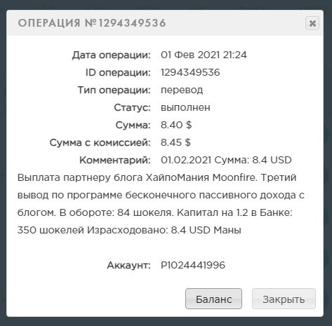 1.2.2021 Сумма: 10.00 USD + 60 шокелей ( возврат 15 USD ) Выплата партнеру блога ХайпоМания ( 100% страховки и 200% рефбек ) altejka. Шестой вывод по программе бесконечного пассивного дохода с блогом. В обороте: 250 шокелей. Капитал на 1.2.2021 в Банке: 500 шокелей Израсходовано: 10 USD Маны