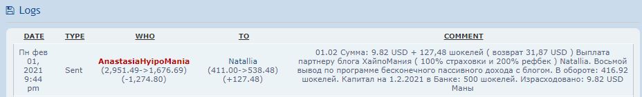 01.02 Сумма: 9.82 USD + 127,48 шокелей ( возврат 31,87 USD ) Выплата партнеру блога ХайпоМания ( 100% страховки и 200% рефбек ) Natallia. Восьмой вывод по программе бесконечного пассивного дохода с блогом. В обороте: 416.92 шокелей. Капитал на 1.2.2021 в Банке: 500 шокелей. Израсходовано: 9.82 USD Маны