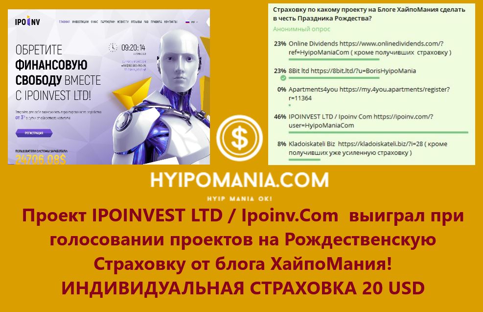 📣 Проект IPOINVEST LTD / Ipoinv Com ( https://ipoinv.com/?user=HyipoManiaCom ) с доходом 150% за 50 дней, лимитами на вклады и до 14% бонусом ( 200% рефбек ) от ХайпоМании - выиграл при голосовании желаемых проектов на Рождественскую Страховку от блога!