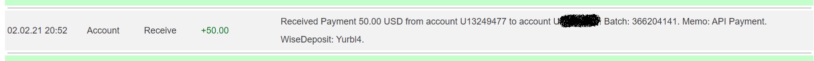 02.02.21 20:52 Account Receive +50.00 Received Payment 50.00 USD from account U13249477. Batch: 366204141. Memo: API Payment. WiseDeposit: Yurbl4.