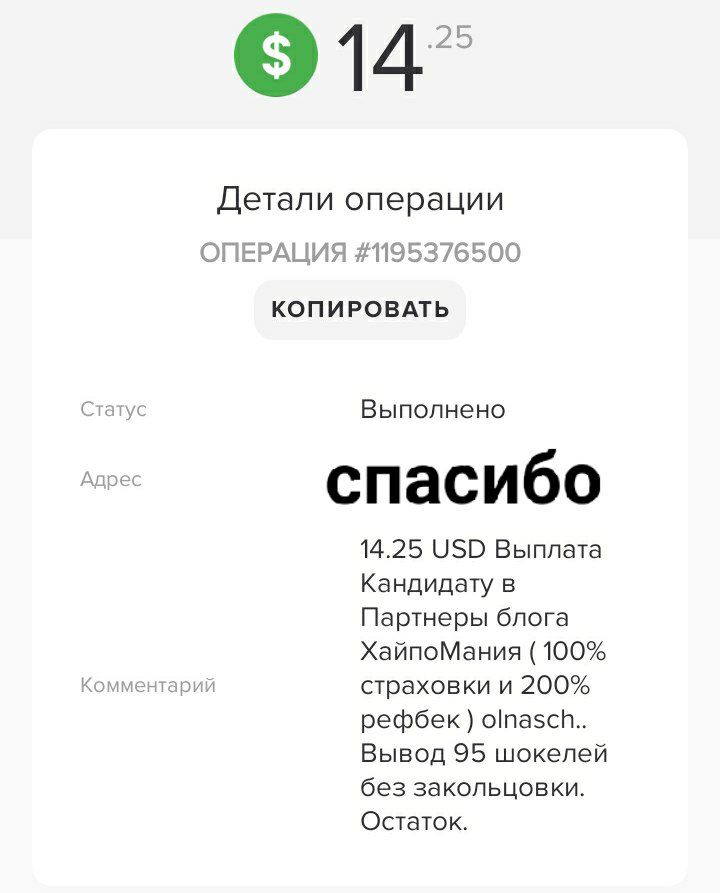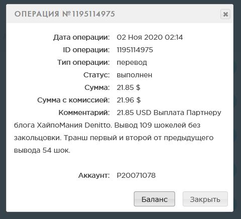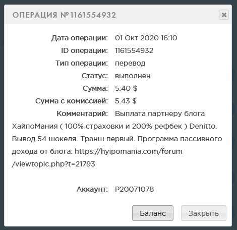 anastasia6 писал(а): ↑Вс ноя 01, 2020 5:17 pmСумма: 41.00 USD Выплата партнеру блога ХайпоМания ( 100% страховки и 200% рефбек ) Vitaly2020. Третий вывод по программе бесконечного пассивного дохода с блогом. В обороте: 410 шокелей. Капитал на 1.11 в Банке: 500 шокелей.anastasia6 писал(а): ↑Чт окт 01, 2020 4:03 pmanastasia6 писал(а): ↑Чт окт 01, 2020 4:01 pm