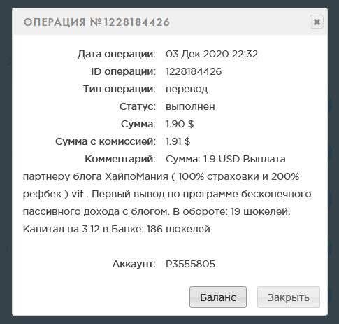 Сумма: 10.00 USD Выплата партнеру блога ХайпоМания ( 100% страховки и 200% рефбек ) altejka. Третий вывод по программе бесконечного пассивного дохода с блогом. В обороте: 100 шокелей. Капитал на 1.11 в Банке: 415 шокелей.Сумма: 15.00 USD Выплата партнеру блога ХайпоМания ( 100% страховки и 200% рефбек ) altejka. Четвертый вывод по программе бесконечного пассивного дохода с блогом. В обороте: 150 шокелей. Капитал на 1.12 в Банке: 415 шокелей