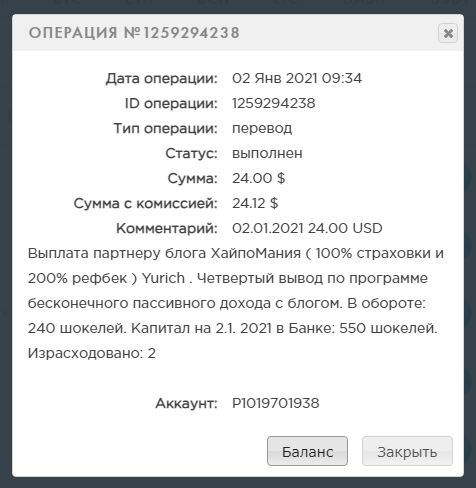 21.00 USD Выплата партнеру блога ХайпоМания ( 100% страховки и 200% рефбек ) Yurich . Третий вывод по программе бесконечного пассивного дохода с блогом. В обороте: 210 шокелей. Капитал на 1.12 в Банке: 500 шокелей. + вывод 70 шокелей без закольцовки ( 17,5 USD ) Сумма: 38.502.01.2021 24.00 USD Выплата партнеру блога ХайпоМания ( 100% страховки и 200% рефбек ) Yurich . Четвертый вывод по программе бесконечного пассивного дохода с блогом. В обороте: 240 шокелей. Капитал на 2.1. 2021 в Банке: 550 шокелей. Израсходовано: 24 USD Маны