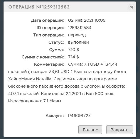 02.01.2021 20.73 USD + 117 шокелей ( возврат 29,27 USD ) Выплата партнеру блога ХайпоМания Vitaly2020. Пятый вывод по программе бесконечного пассивного дохода с блогом. В обороте: 500 шокелей. Капитал на 02.01.2021 в Банке: 500 шокелей. Израсходовано: 20.73 USD Маны
