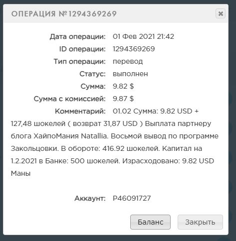 01.02 Сумма: 9.82 USD + 127,48 шокелей ( возврат 31,87 USD ) Выплата партнеру блога ХайпоМания ( 100% страховки и 200% рефбек ) Natallia. Восьмой вывод по программе бесконечного пассивного дохода с блогом. В обороте: 416.92 шокелей. Капитал на 1.2.2021 в Банке: 500 шокелей. Израсходовано: 9.82 USD Маны
