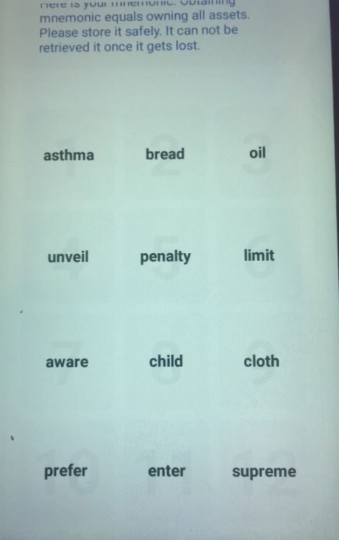 Вам будет предложена мнемоническая фраза из 12 слов, сохраняем ее и жмем кнопку «Continue». На следующей странице последовательность слов во фразе необходимо повторить.