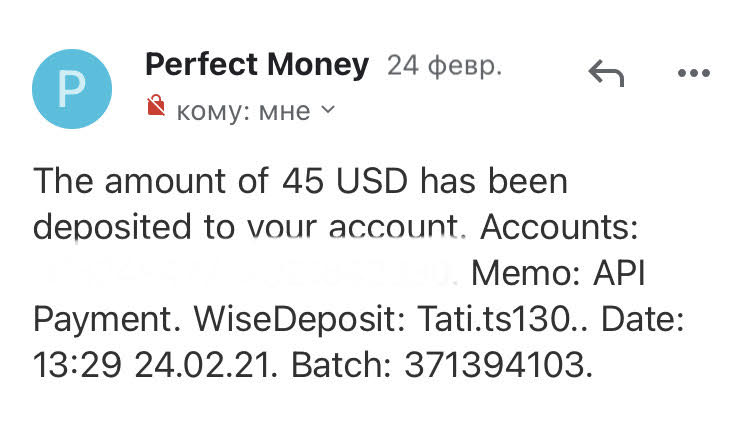 24.02.21 10:44 Receive Received Payment 50.00 USD from account U13249477 to account U24****81. Batch: 371350878. Memo: API Payment. WiseDeposit: sersea765.