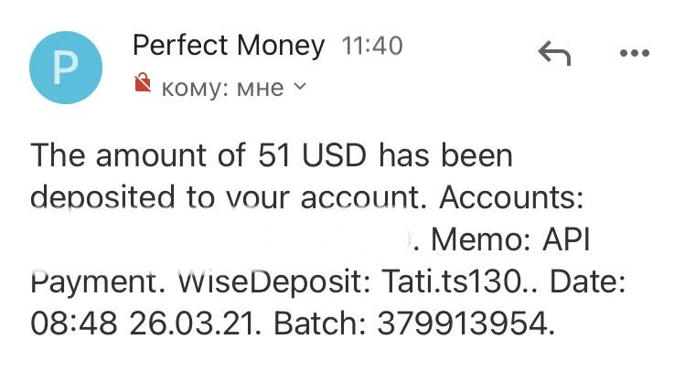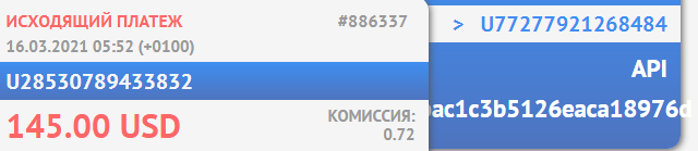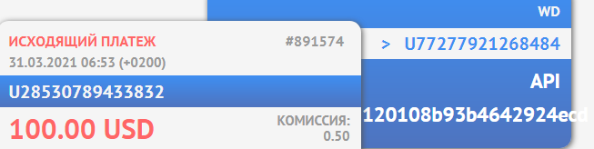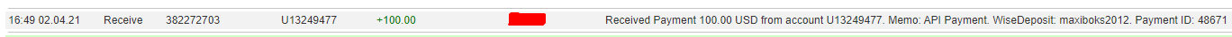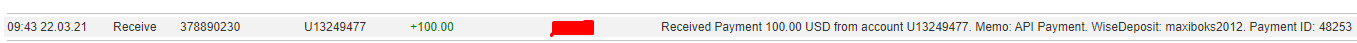 03.29.21 10:35 Account Receive +100.00 Received Payment 100.00 USD from account U13249477. Batch: 380689417. Memo: API Payment. WiseDeposit: annakom875.