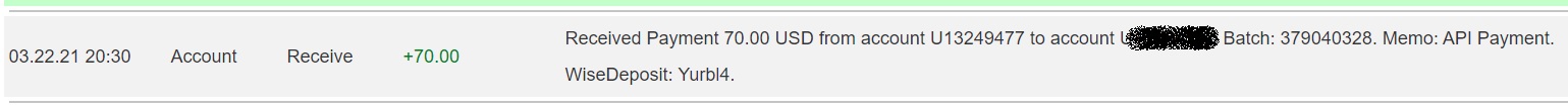 03.22.21 20:30 Account Receive +70.00 Received Payment 70.00 USD from account U13249477. Batch: 379040328. Memo: API Payment. WiseDeposit: Yurbl4.