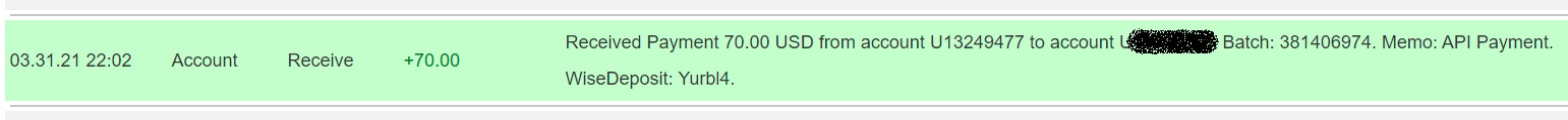 03.31.21 22:02 Account Receive +70.00 Received Payment 70.00 USD from account U13249477. Batch: 381406974. Memo: API Payment. WiseDeposit: Yurbl4.