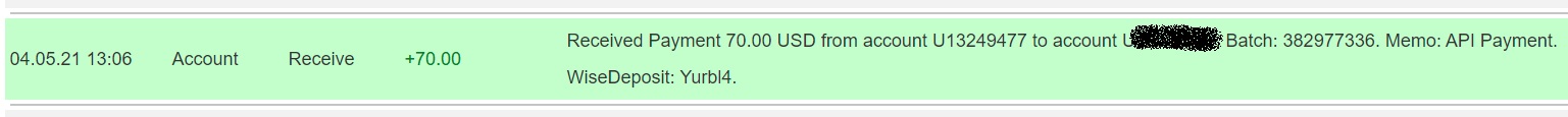 04.05.21 13:06 Account Receive +70.00 Received Payment 70.00 USD from account U13249477. Batch: 382977336. Memo: API Payment. WiseDeposit: Yurbl4.