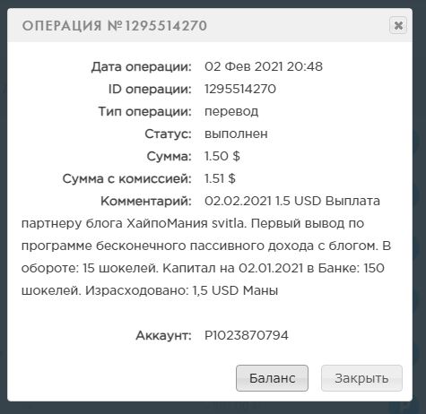 02.02.2021 1.5 USD Выплата партнеру блога ХайпоМания svitla. Первый вывод по программе бесконечного пассивного дохода с блогом. В обороте: 15 шокелей. Капитал на 02.01.2021 в Банке: 150 шокелей. Израсходовано: 1,5 USD Маны