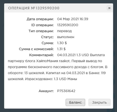 04.03.2021 1.3 USD Выплата партнеру блога ХайпоМания raakot. Первый вывод по программе бесконечного пассивного дохода с блогом. В обороте: 13 шокелей. Капитал на 04.03.2021 в Банке: 119 шокелей. Израсходовано: 1.3 USD Маны