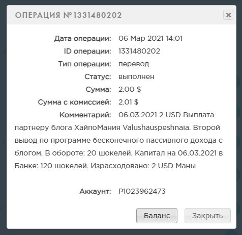 06.03.2021 2 USD Выплата партнеру блога ХайпоМания Valushauspeshnaia. Второй вывод по программе бесконечного пассивного дохода с блогом. В обороте: 20 шокелей. Капитал на 06.03.2021 в Банке: 120 шокелей. Израсходовано: 2 USD Маны