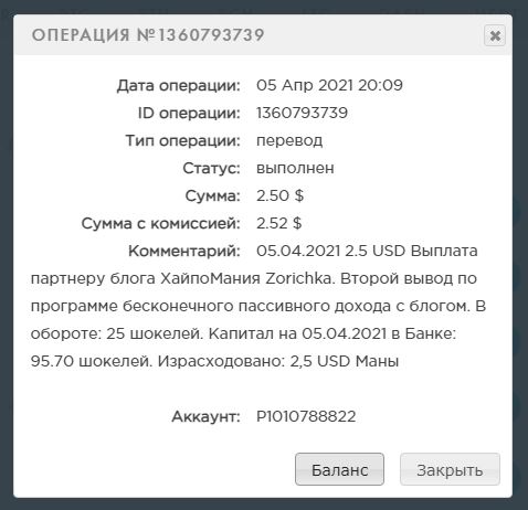 05.04.2021 2.5 USD Выплата партнеру блога ХайпоМания Zorichka. Второй вывод по программе бесконечного пассивного дохода с блогом. В обороте: 25 шокелей. Капитал на 05.04.2021 в Банке: 95.70 шокелей. Израсходовано: 2,5 USD Маны