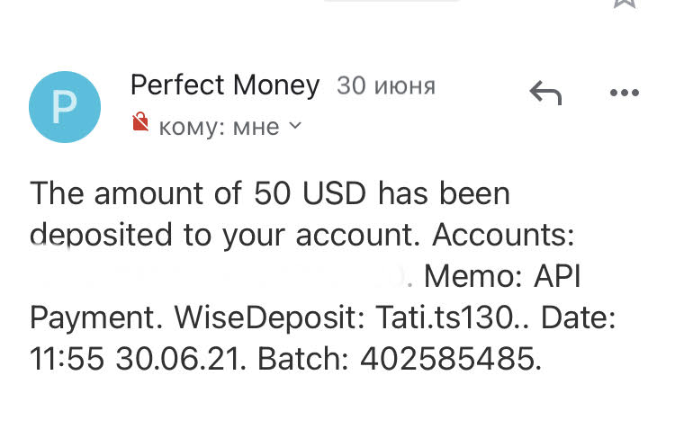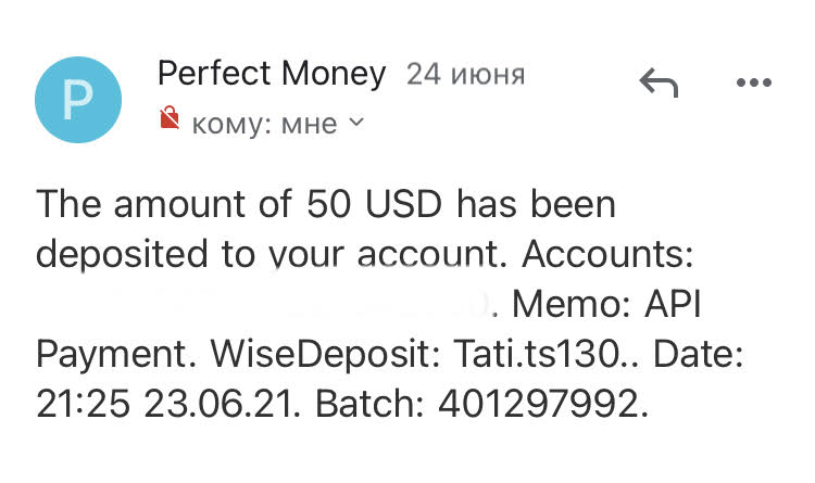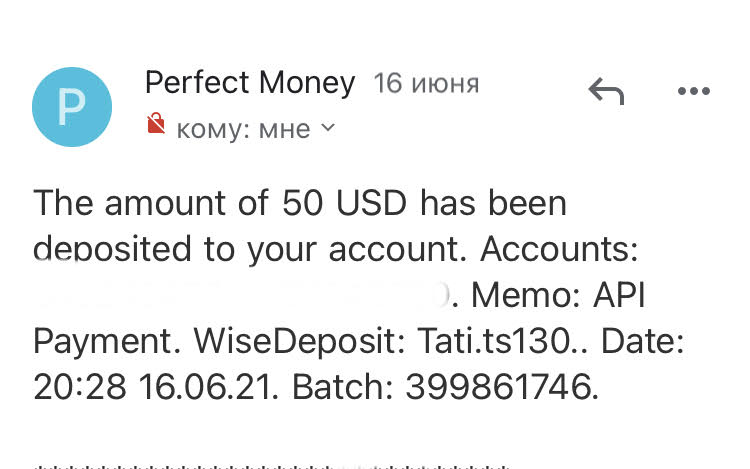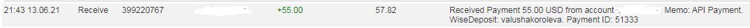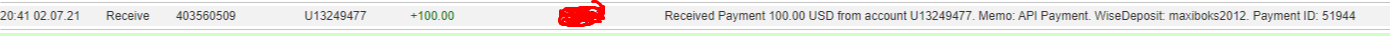 21.06.21 21:42 Receive +100.00 Received Payment 100.00 USD from account U13249477. . Batch: 397880073 Memo: API Payment. WiseDeposit: annakom875.