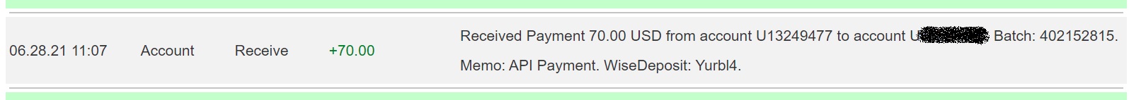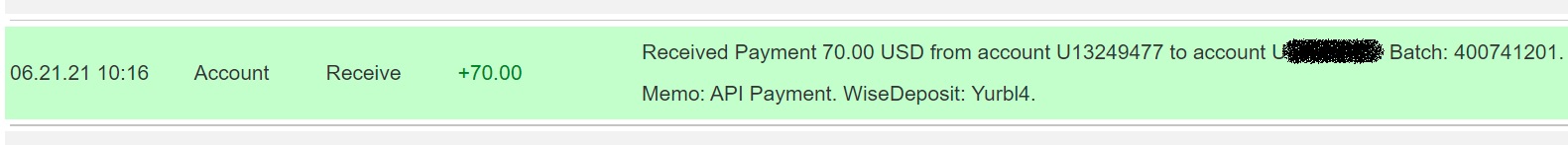 06.21.21 10:16 Account Receive +70.00 Received Payment 70.00 USD from account U13249477. Batch: 400741201. Memo: API Payment. WiseDeposit: Yurbl4.