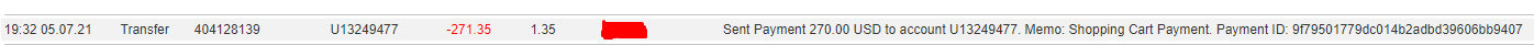 07.05.21 03:43 Account Transfer -120.00 Sent Payment: 120.00 USD to account U13249477. Batch: 403964763. Memo: Shopping Cart Payment.