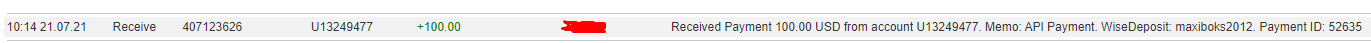 07.26.21 10:09 Receive +100.00 Received Payment 100.00 USD from account U13249477 . Batch: 406759649 Memo: API Payment. WiseDeposit: annakom875.