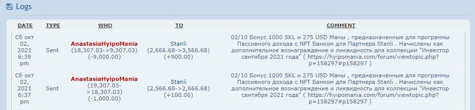 02/10 Бонус 1000 SKL и 275 USD Маны , предназначенные для программы Пассивного дохода с NFT Банком для Партнера Stanli . Начислены как дополнительное вознаграждение и ликвидность для коллекции "Инвестор сентября 2021 года" ( https://hyipomania.com/forum/viewtopic. ... 97#p158297 )