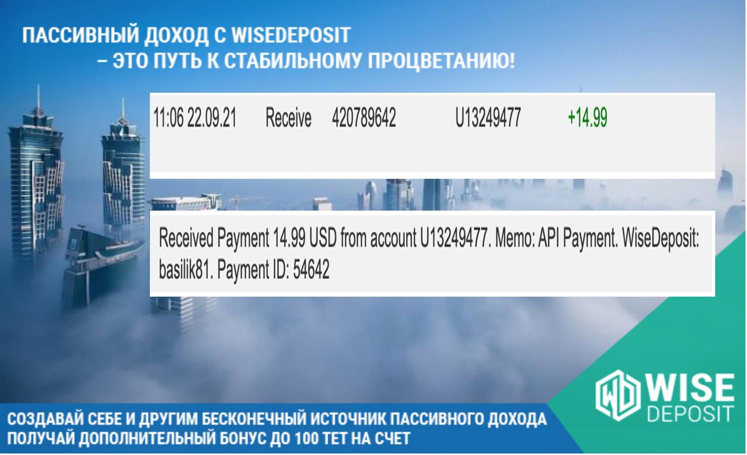 Получил первую выплату с инвестиционного проекта Wise Deposite в размере 60$.