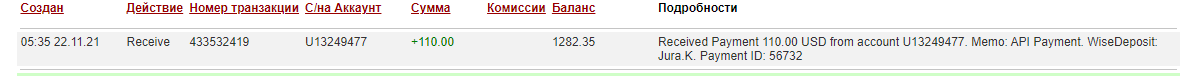 11.24.21 17:10 Account Receive +120.00 Received Payment 120.00 USD from account U13249477 to account U27713196. Batch: 434043379. Memo: API Payment. WiseDeposit: drakonovdom.