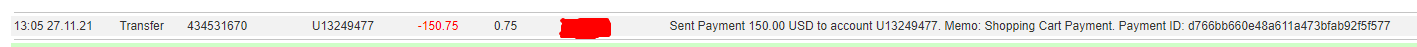 05:01 29.11.21 Transfer 434808535 U13249477 -149.74 Sent Payment 149.00 USD to account U13249477. Memo: Shopping Cart Payment. Payment ID: 896f9083975f3abc92ee8324f847910b