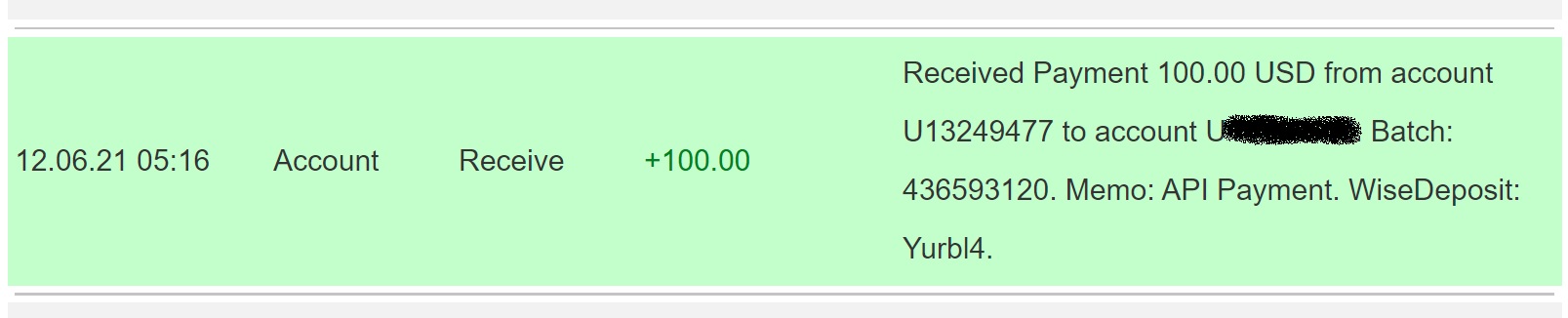12.06.21 05:16 Account Receive +100.00 Received Payment 100.00 USD from account U13249477. Batch: 436593120. Memo: API Payment. WiseDeposit: Yurbl4.