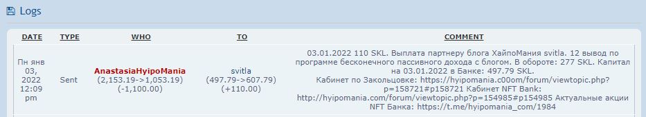 03.01.2022 110 SKL. Выплата партнеру блога ХайпоМания svitla. 12 вывод по программе бесконечного пассивного дохода с блогом. В обороте: 277 SKL. Капитал на 03.01.2022 в Банке: 497.79 SKL.