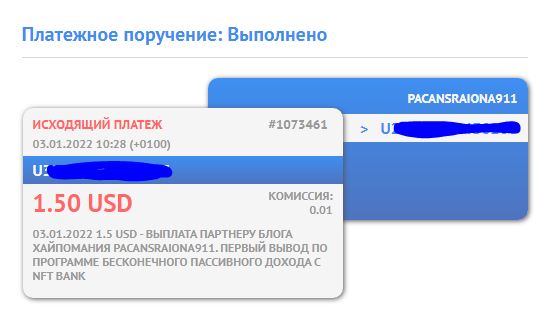 03.01.2022 1.5 USD - выплата партнеру блога ХайпоМания PACANSRAIONA911. Первый вывод по программе бесконечного пассивного дохода с NFT BANK. В обороте: 15 SKL. Капитал на 02.1.2022 в Банке: 152.00 SKL. Израсходовано: 1.5 USD Маны
