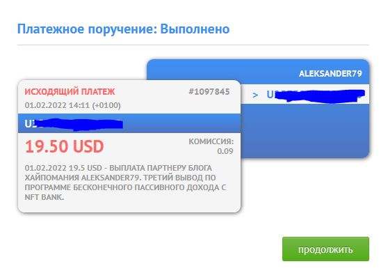 01.02.2022 19.5 USD - выплата партнеру блога ХайпоМания Aleksander79. Третий вывод по программе бесконечного пассивного дохода с NFT BANK. В обороте: 195 SKL. Капитал на 04.01.2022 в Банке: 971.80 SKL. Израсходовано: 19.5 USD Маны