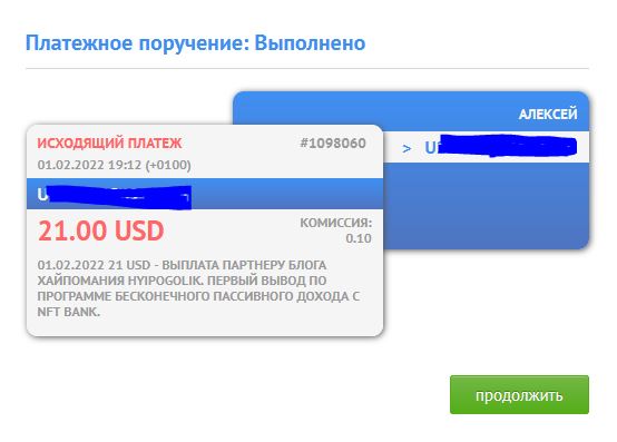 01.02.2022 7 USD - выплата партнеру блога ХайпоМания PACANSRAIONA911. Второй вывод по программе бесконечного пассивного дохода с NFT BANK. В обороте: 70 SKL. Капитал на 01.2.2022 в Банке: 550.00 SKL. Израсходовано: 7 USD Маны