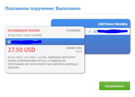 02.02.2022 27,5 USD + 16 SKL. Выплата партнеру блога ХайпоМания svitla. 13 вывод по программе бесконечного пассивного дохода с блогом. В обороте: 315 SKL. Капитал на 02.02.2022 в Банке: 647.84 SKL. Израсходовано 27.5 USD Маны