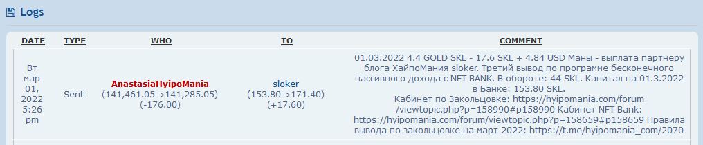 01.03.2022 4.4 GOLD SKL - 17.6 SKL + 4.84 USD Маны - выплата партнеру блога ХайпоМания sloker. Третий вывод по программе бесконечного пассивного дохода с NFT BANK. В обороте: 44 SKL. Капитал на 01.3.2022 в Банке: 153.80 SKL.