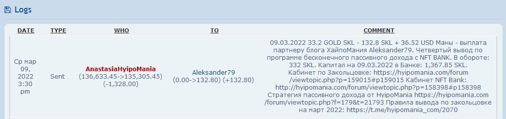09.03.2022 33.2 GOLD SKL - 132.8 SKL + 36.52 USD Маны - выплата партнеру блога ХайпоМания Aleksander79. Четвертый вывод по программе бесконечного пассивного дохода с NFT BANK. В обороте: 332 SKL. Капитал на 09.03.2022 в Банке: 1,367.85 SKL.