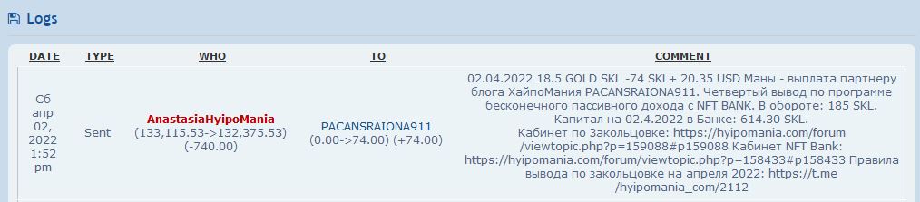 02.04.2022 18.5 GOLD SKL -74 SKL+ 20.35 USD Маны - выплата партнеру блога ХайпоМания PACANSRAIONA911. Четвертый вывод по программе бесконечного пассивного дохода с NFT BANK. В обороте: 185 SKL. Капитал на 02.4.2022 в Банке: 614.30 SKL.