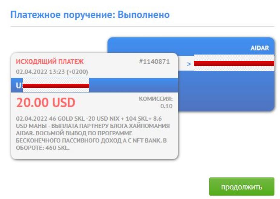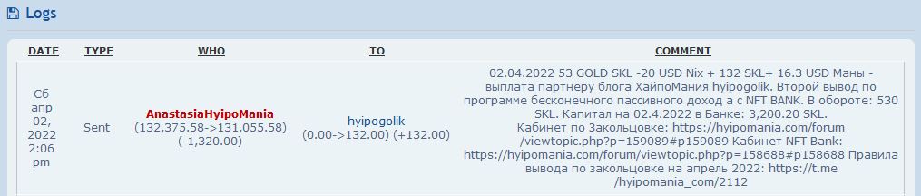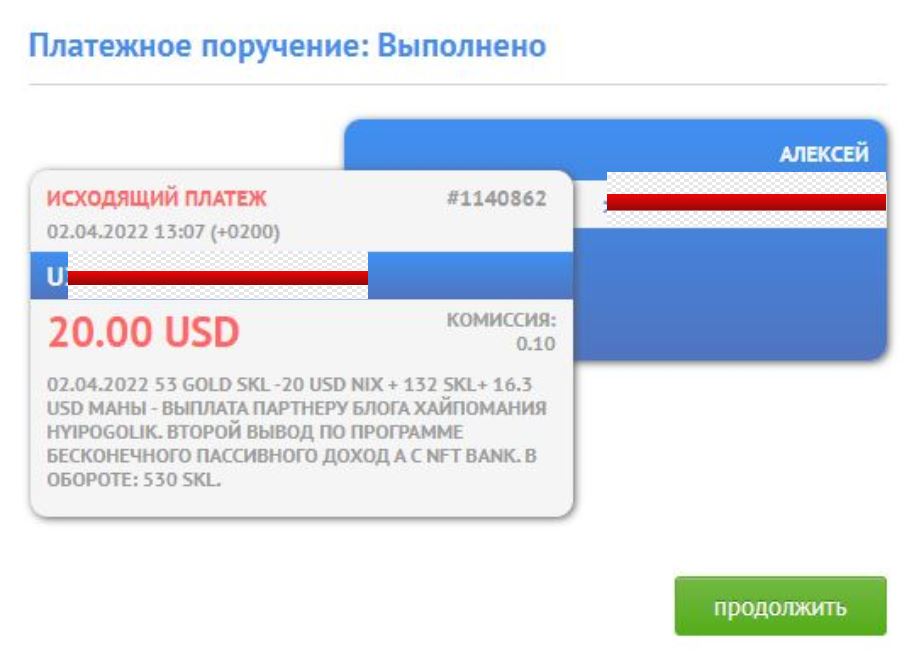 02.04.2022 53 GOLD SKL -20 USD Nix + 132 SKL+ 16.3 USD Маны - выплата партнеру блога ХайпоМания hyipogolik. Второй вывод по программе бесконечного пассивного доход а с NFT BANK. В обороте: 530 SKL. Капитал на 02.4.2022 в Банке: 3,200.20 SKL.