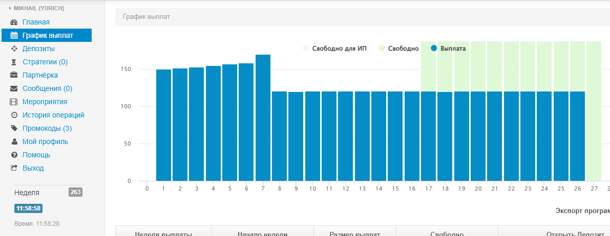Пополнила WiseDeposit через nixmoney на 100$ .Увожу свои накопления вправо с плавным ростом . Так как мест на последующие недели не оказалось, пришлось пропустить несколько(не страшно) и расположить депозиты подальше, образовался просвет, потом заполню). Стала 57 неделя на 5 тет выше, теперь ожидаю выплату в 165 тет. Карма 54.88%.