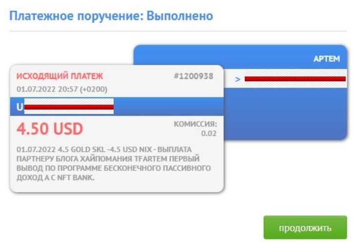 02.06.2022 36.2 GOLD SKL -20 USD Nix + 2 NFT Minimum выплата партнеру блога ХайпоМания PACANSRAIONA911. Шестой вывод по программе бесконечного пассивного дохода с NFT BANK. В обороте: 270 SKL. Капитал на 04.5.2022 в Банке: 929.34 SKL. Израсходовано 27 USD Маны