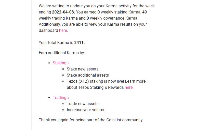 Еженедельные очки кармы начисляются за еженедельные дополнительные действия в CoinList. На данный момент это торговля на CoinList, CoinList Pro и мобильном приложении CoinList, а также стейкинг Nucypher, Casper, Flow и Rose.