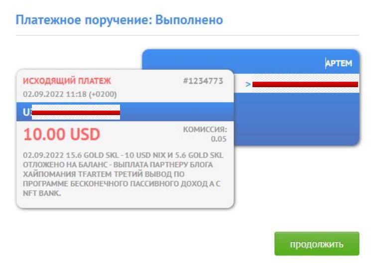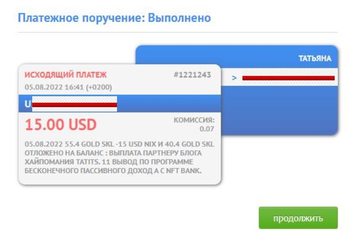 01.09.2022 15.6 GOLD SKL - 10 USD Nix и 5.6 GOLD SKL отложено на баланс - выплата партнеру блога ХайпоМания tfartem Третий вывод по программе бесконечного пассивного доход а с NFT BANK. В обороте: 156 SKL. Капитал на 01.9.2022 в Банке: 578.81 SKL. Израсходовано 10 USD Маны Кабинет по Закольцовке: http://hyipomania.com/forum/viewtopic.p ... 54#p159654 Кабинет NFT Bank: viewtopic.php?p=156486#p156486 Правила вывода по закольцовке на сентябрь 2022: https://t.me/hyipomania_com/2316 Покупка любого NFT с 26.08 до 4.09 от NFT Банка - получение бонуса по акции "Адаптация-15" https://t.me/hyipomania_com/2315