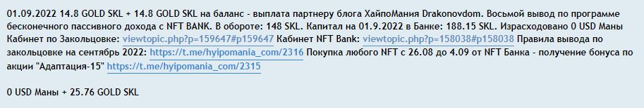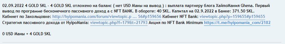 01.09.2022 14.8 GOLD SKL + 14.8 GOLD SKL на баланс - выплата партнеру блога ХайпоМания Drakonovdom. Восьмой вывод по программе бесконечного пассивного дохода с NFT BANK. В обороте: 148 SKL. Капитал на 01.9.2022 в Банке: 188.15 SKL. Израсходовано 0 USD Маны Кабинет по Закольцовке: viewtopic.php?p=159647#p159647 Кабинет NFT Bank: viewtopic.php?p=158038#p158038 Правила вывода по закольцовке на сентябрь 2022: https://t.me/hyipomania_com/2316 Покупка любого NFT с 26.08 до 4.09 от NFT Банка - получение бонуса по акции "Адаптация-15" https://t.me/hyipomania_com/2315
