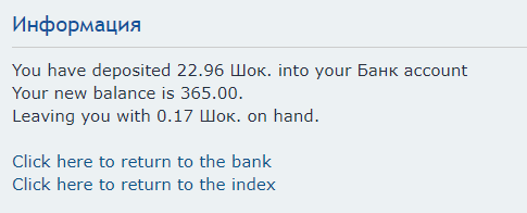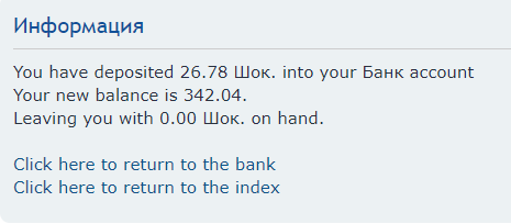 "You have deposited 10.00 Шок. into your Банк account